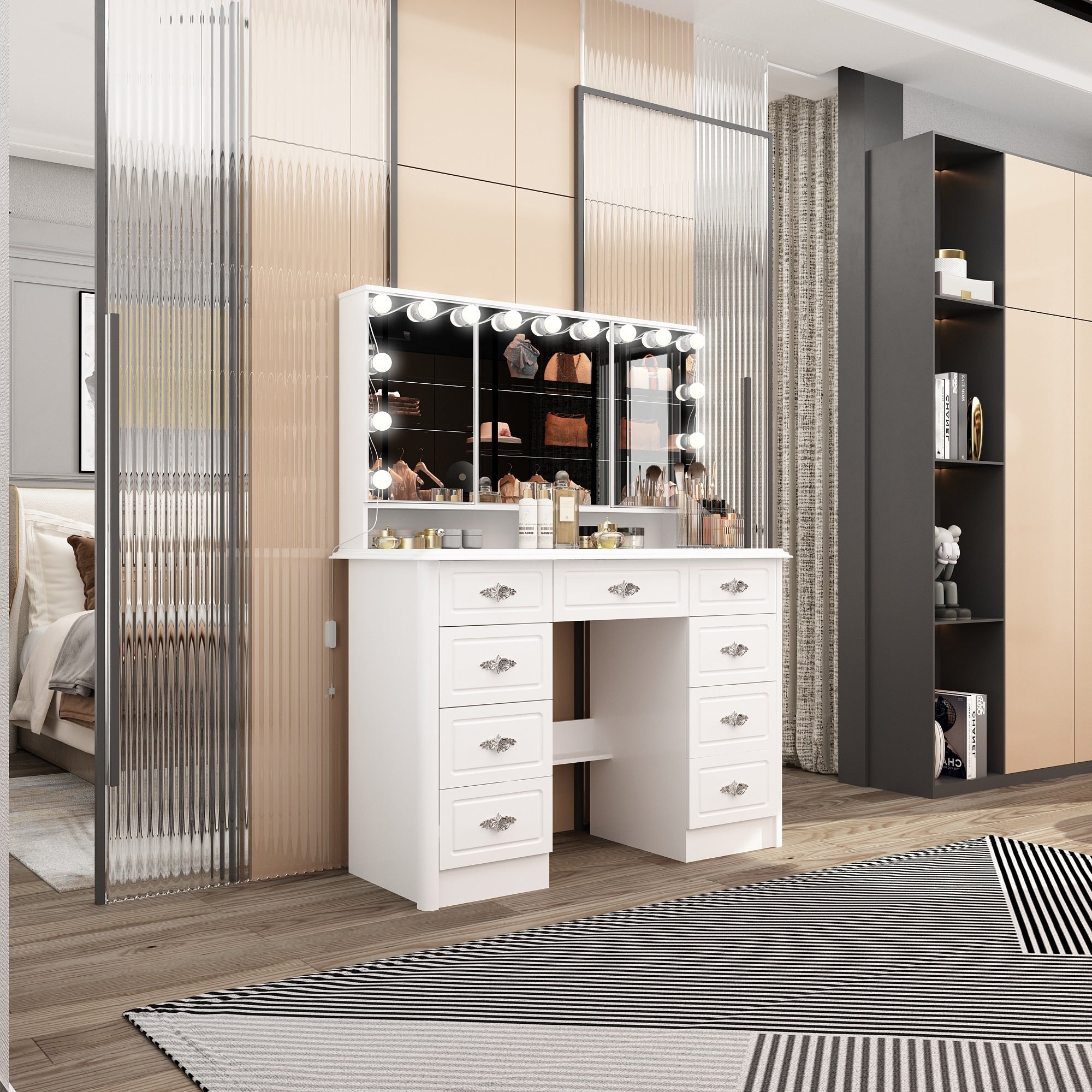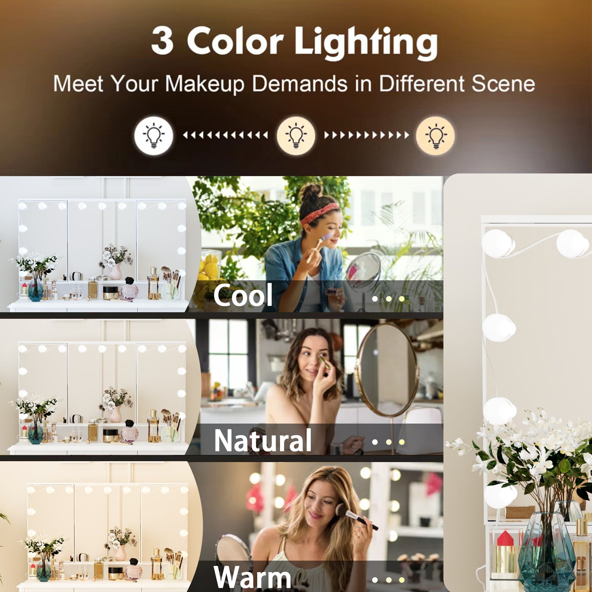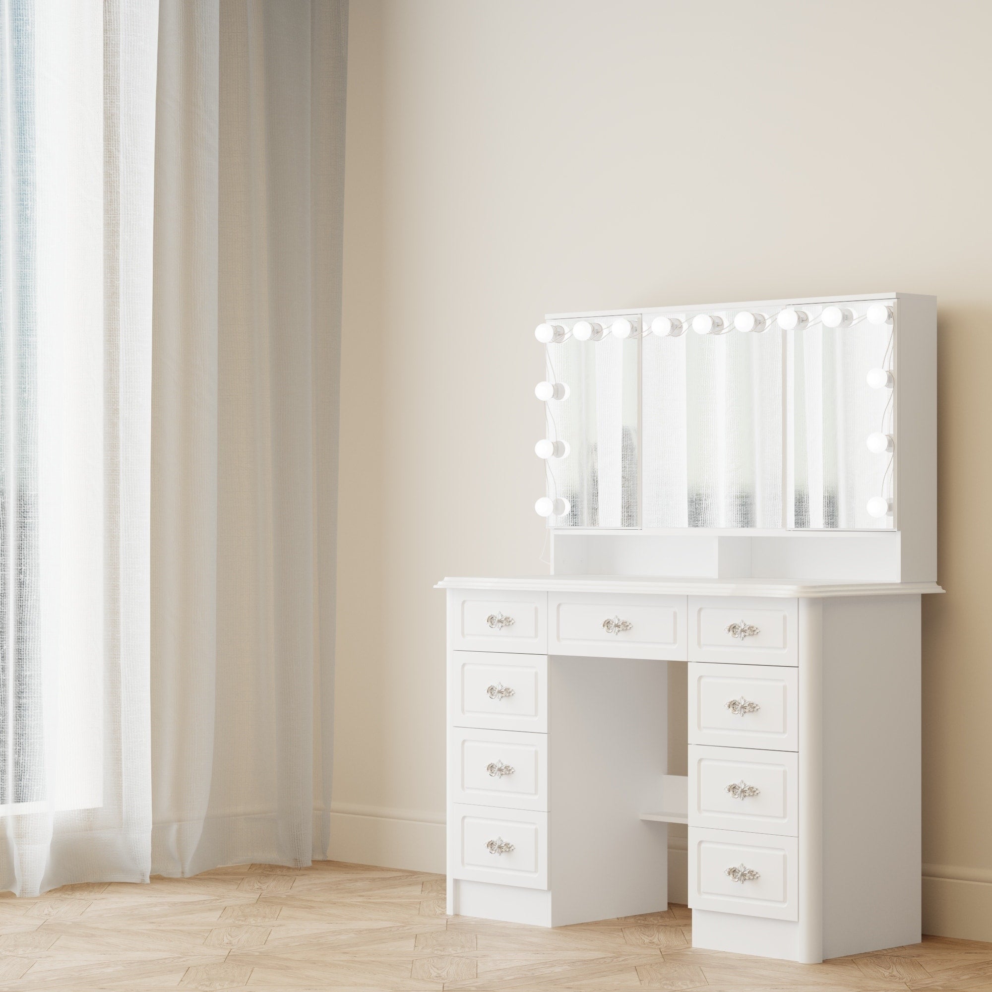 Coiffeuse avec miroir à trois volets et éclairage certifié, plateau en verre Coiffeuse avec miroir à trois volets et éclairage certifié, plateau en verre