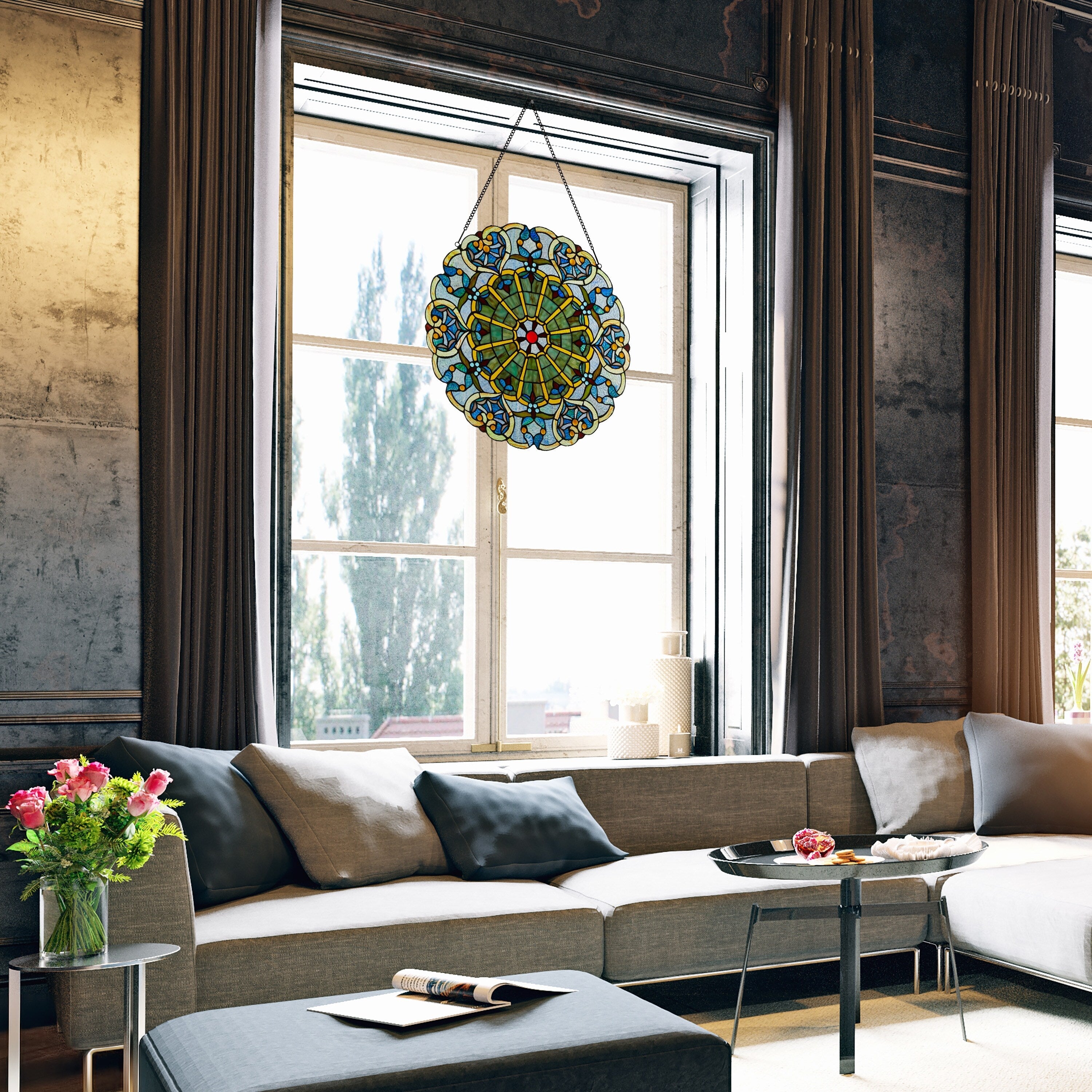 Ajoutez une touche de tradition et d'élégance à n'importe quelle pièce avec ce panneau de vitrail d'inspiration victorienne de 55 cm. Orné d'un magnifique motif de cœur palmé aux riches nuances de bleu, ce panneau suscitera assurément la conversation. Fabriqué à la main en vitrail, il capte et reflète magnifiquement la lumière, créant un jeu de couleurs enchanteur lorsqu'il est placé devant une fenêtre ensoleillée. Il est fourni avec une chaîne de suspension de 76 cm pour une installation facile. Facile à nettoyer, il suffit d'un chiffon humide ou d'un produit à polir à l'huile de citron et d'un chiffon doux et sec pour préserver ses couleurs éclatantes.